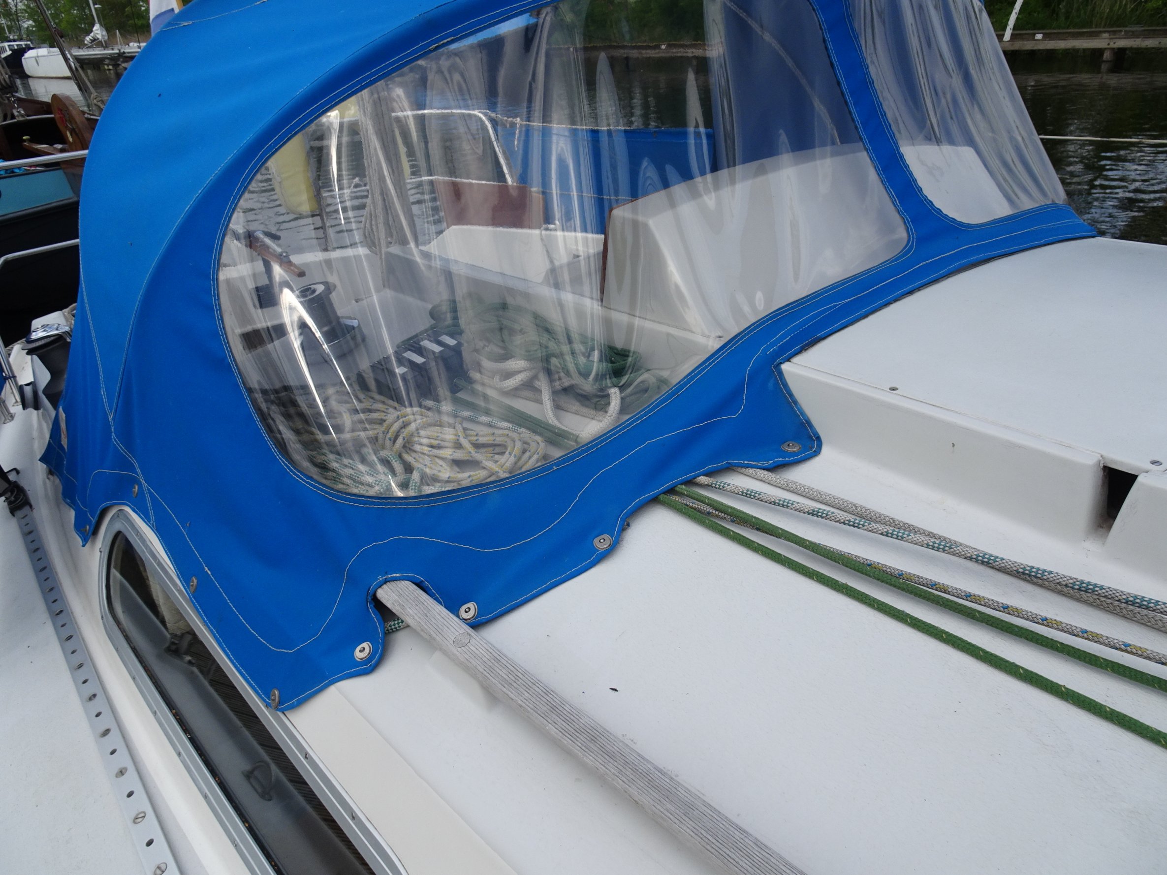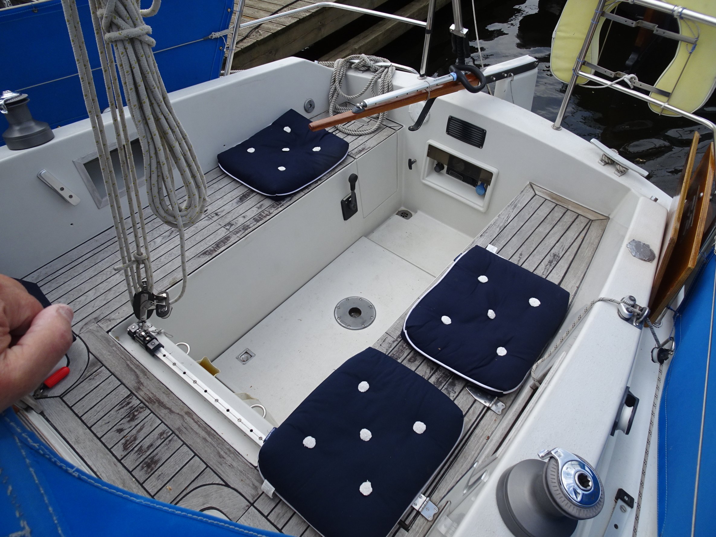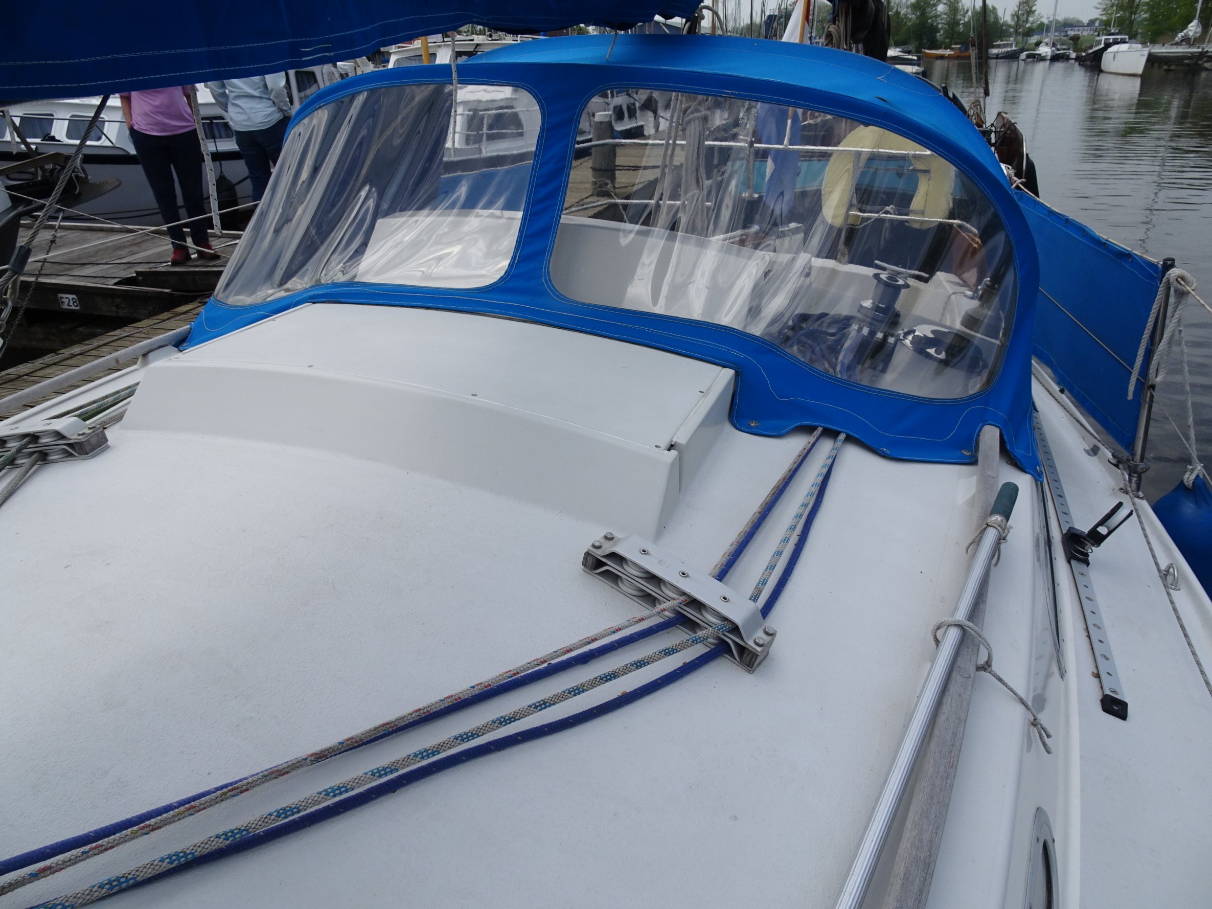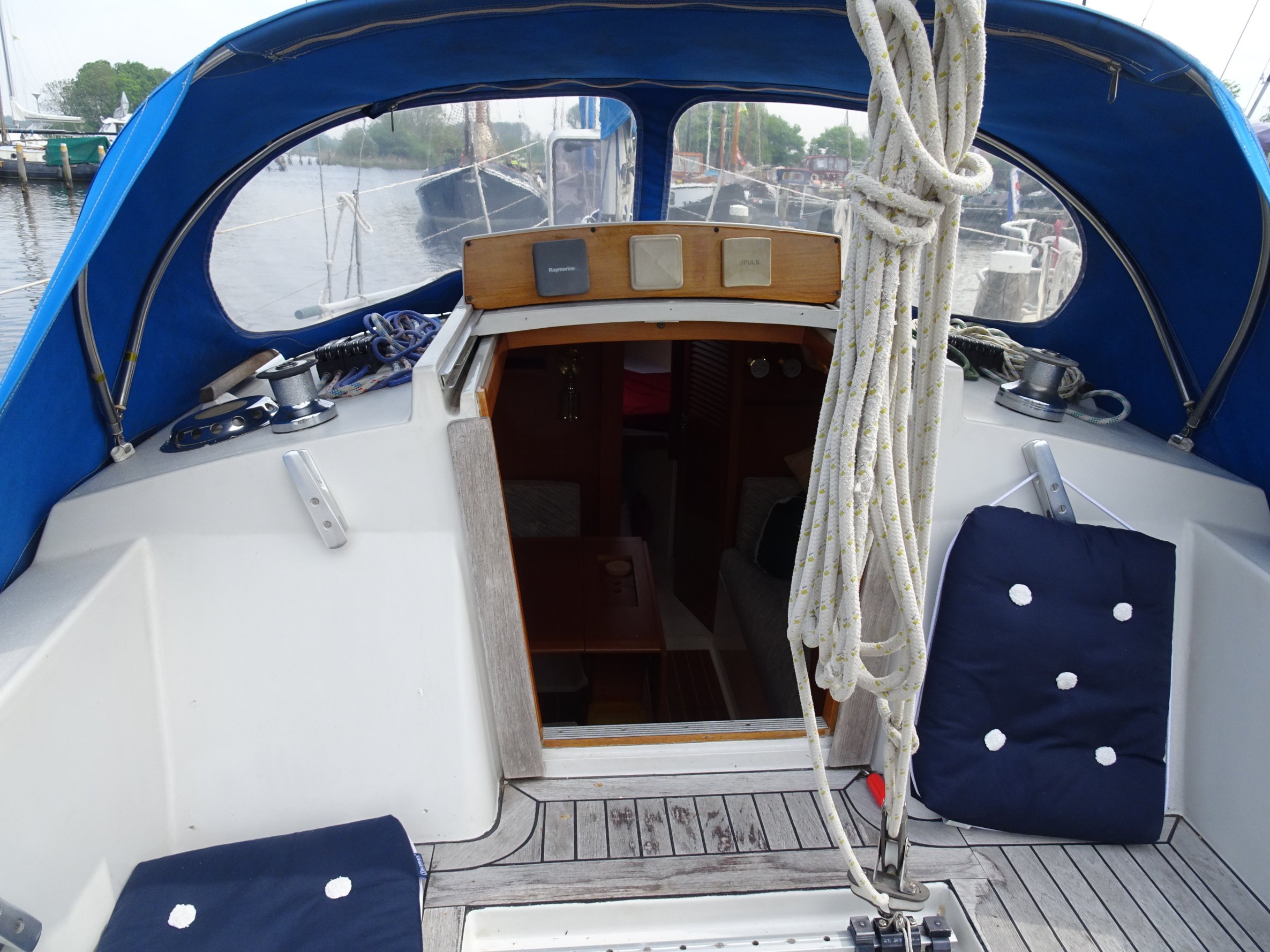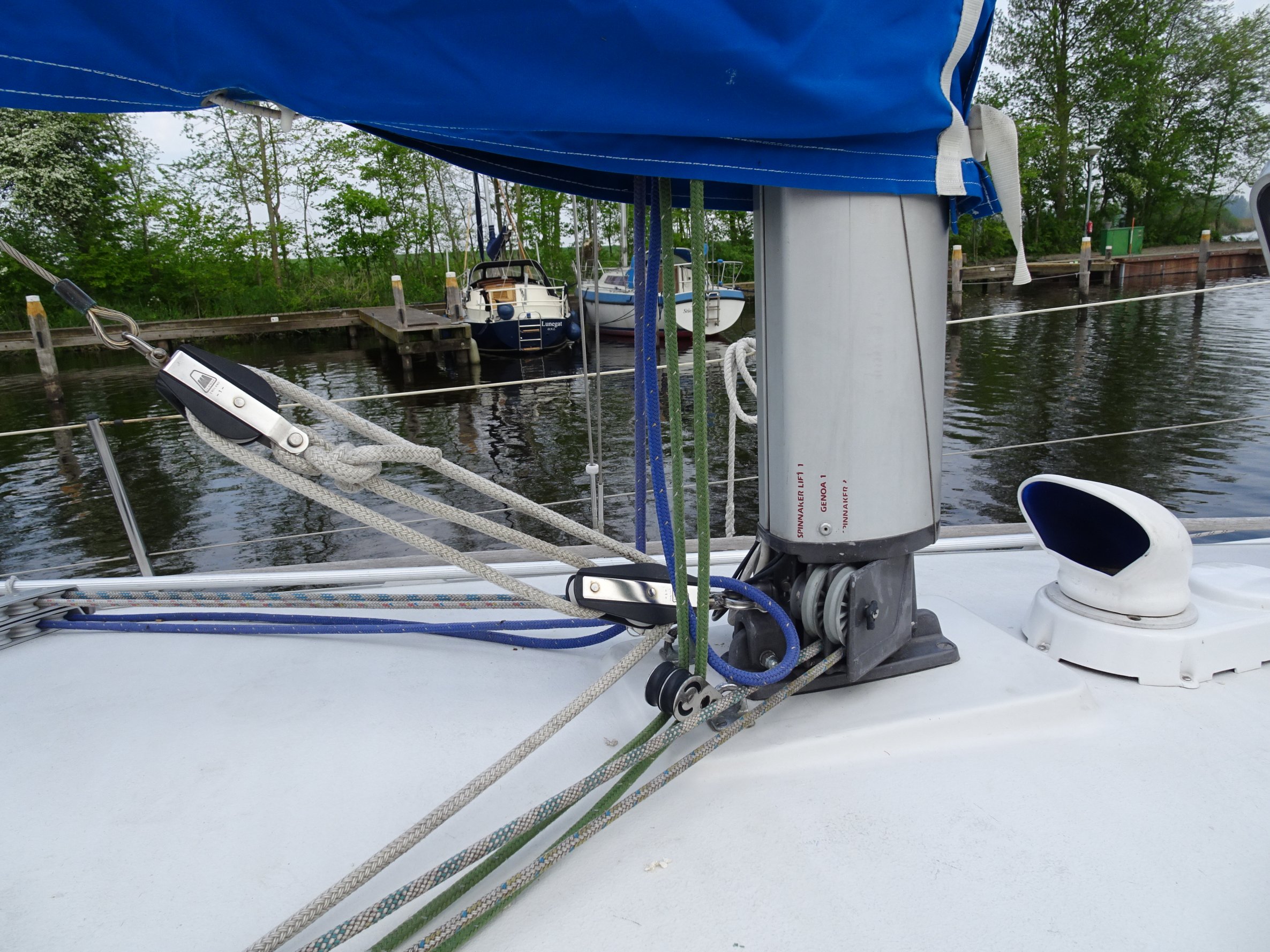 Dan de zeilen, het is tenslotte een zeiljacht. De zeilen zijn van 1995 en allen in nette bruikbare staat. Voor toerzeilen prima, voor wedstrijdzeilen heb je nieuwe nodig. De zeilgarderobe bestaat uit een grootzeil en Genua, voorzeil staat op een Furlex rol/reefsysteem. Alle schoten, vallen, blokken, lijnen in prima staat. Verder staan er 4 Lewmar lieren aan dek en zijn alle lijnen richting kuip verlegd, prima solo te zeilen dus. De Sprayhood, huik voor het grootzeil en voorzeil in zeer goede staat, bekijk de foto’s maar even. Zeer netjes.