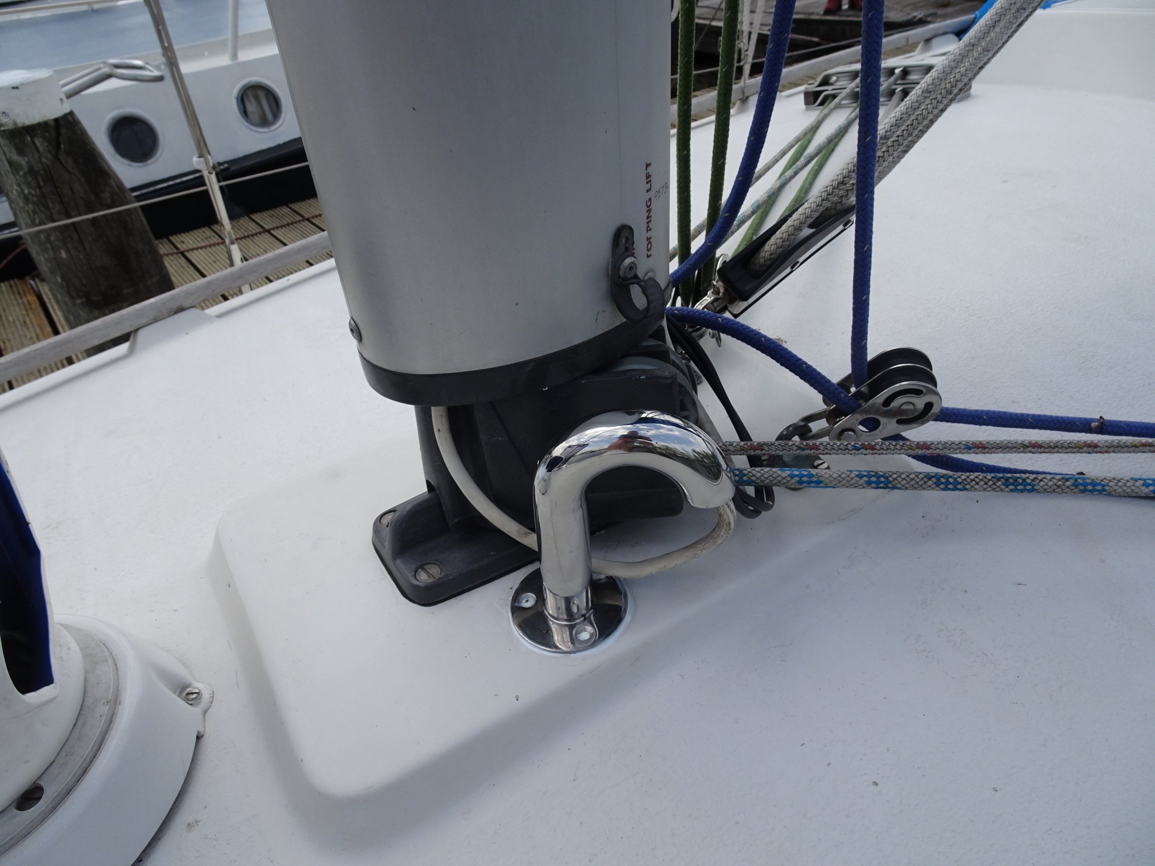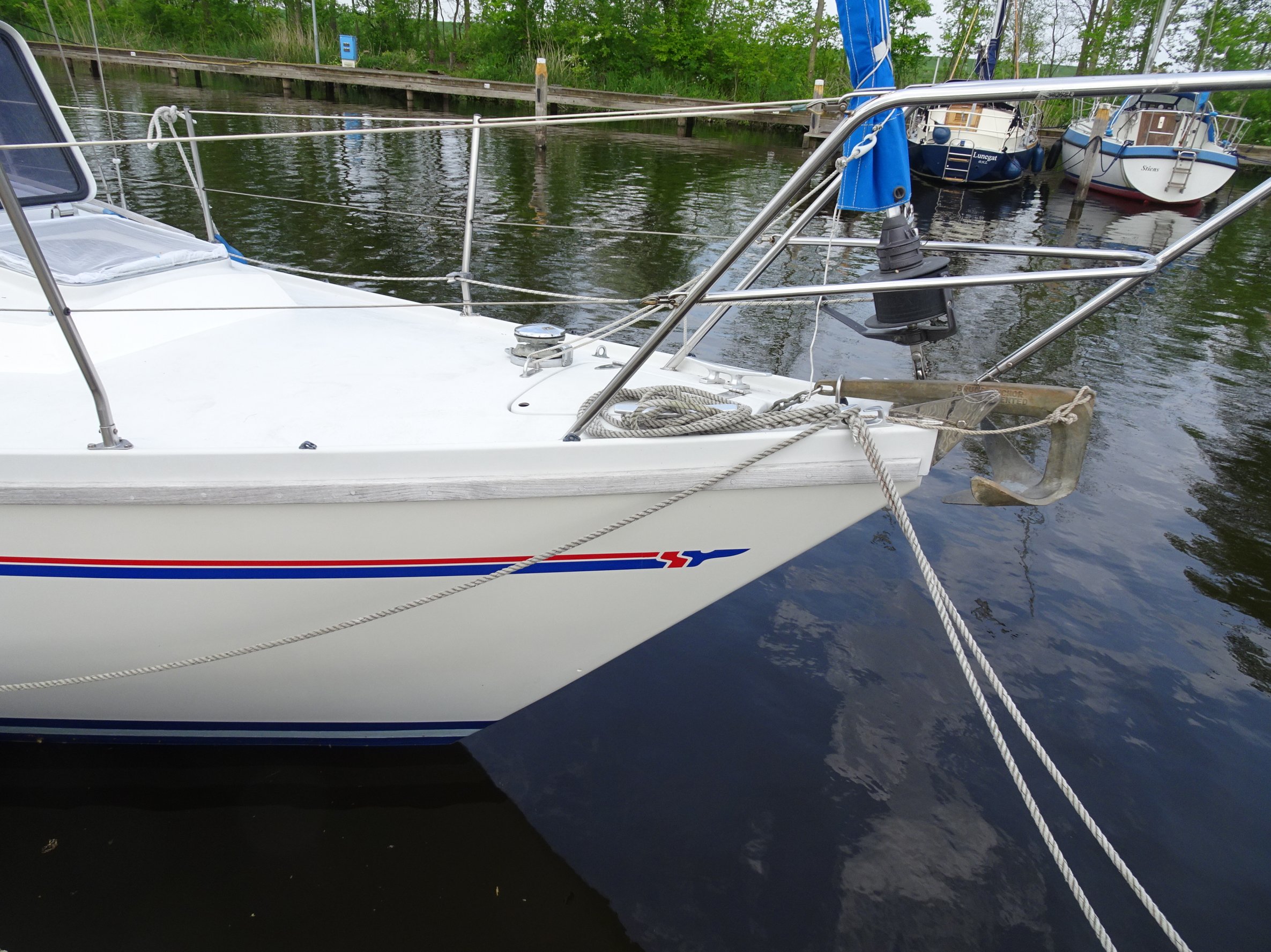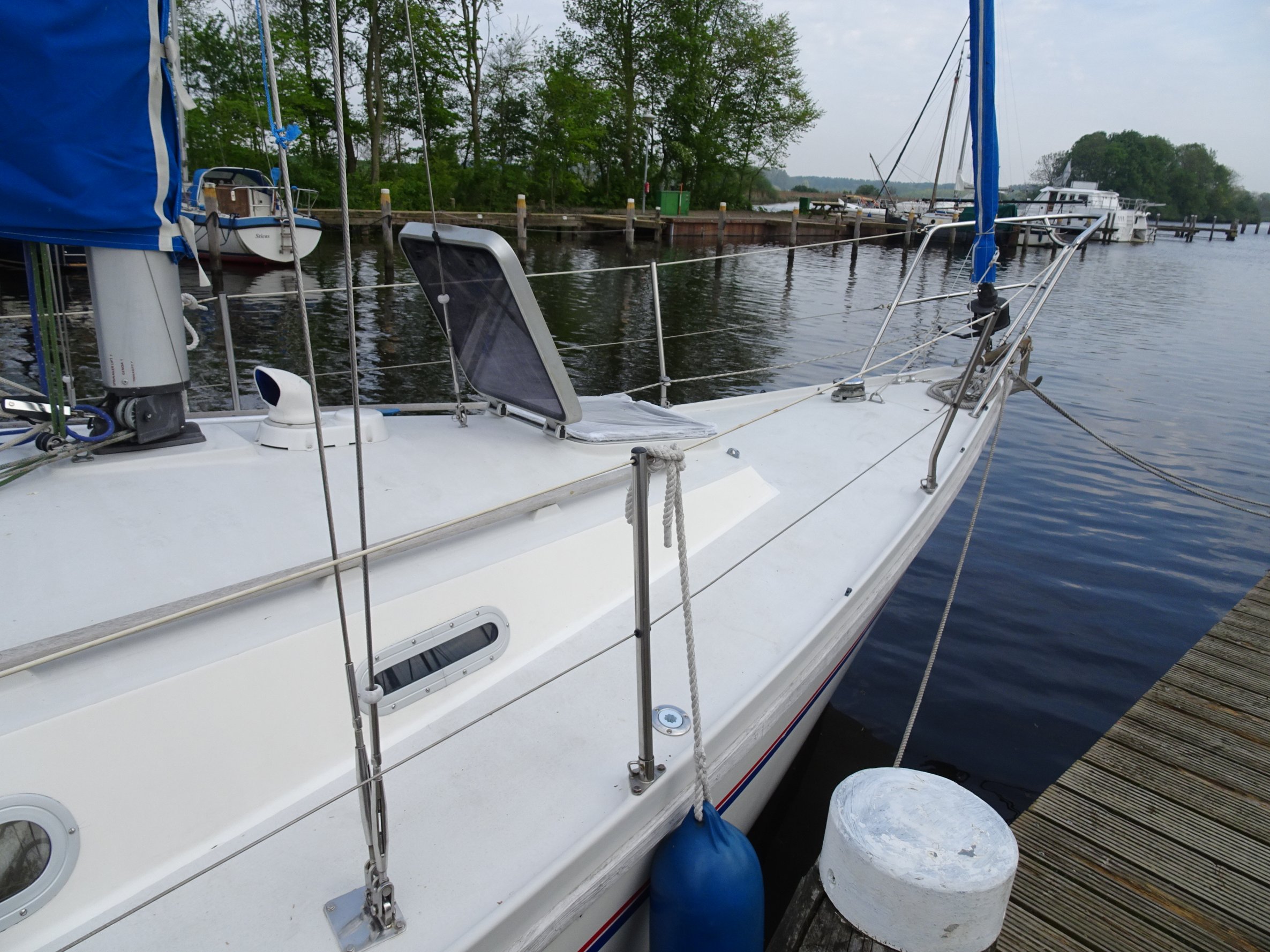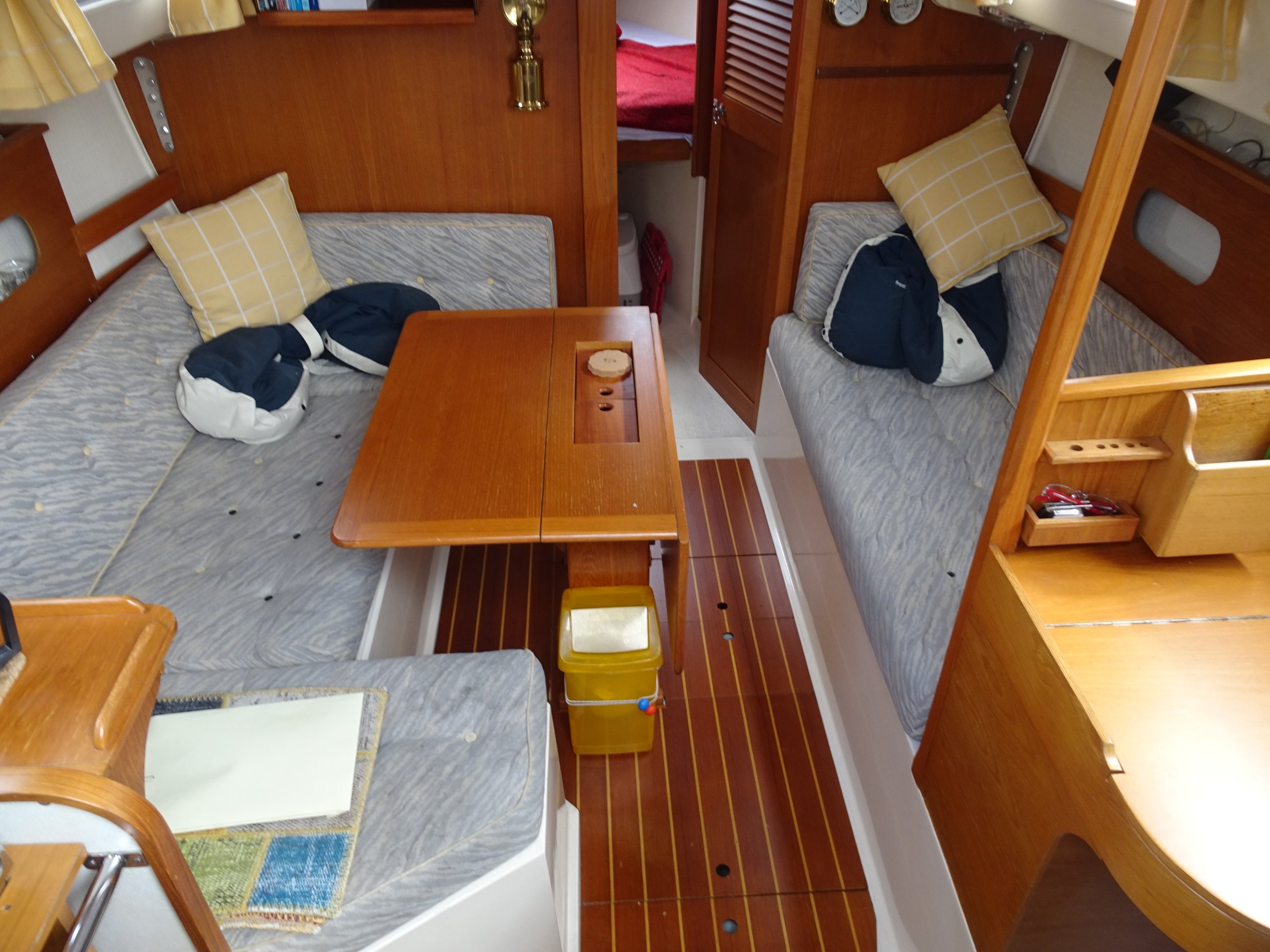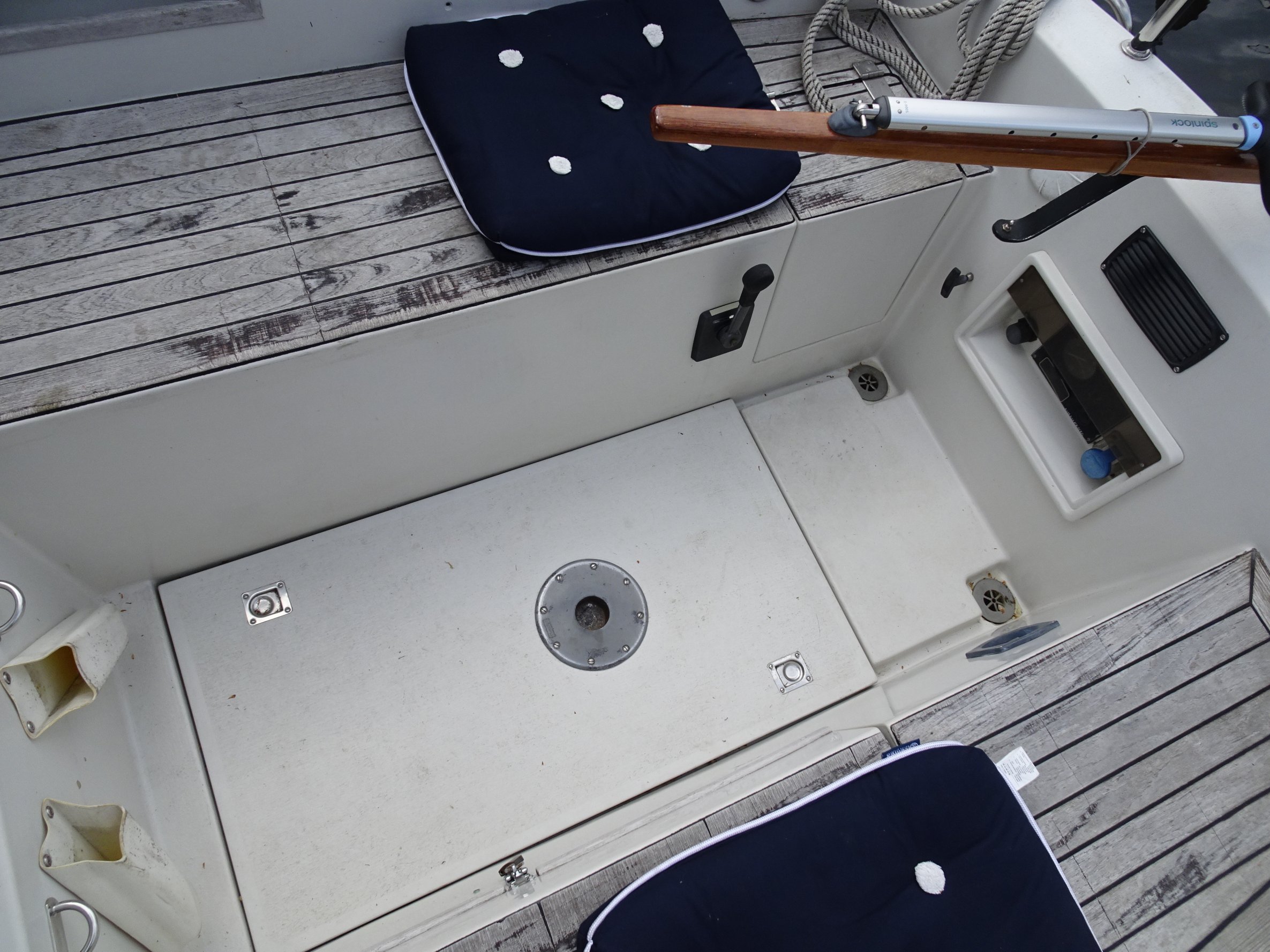 Dan de zeilen, het is tenslotte een zeiljacht. De zeilen zijn van 1995 en allen in nette bruikbare staat. Voor toerzeilen prima, voor wedstrijdzeilen heb je nieuwe nodig. De zeilgarderobe bestaat uit een grootzeil en Genua, voorzeil staat op een Furlex rol/reefsysteem. Alle schoten, vallen, blokken, lijnen in prima staat. Verder staan er 4 Lewmar lieren aan dek en zijn alle lijnen richting kuip verlegd, prima solo te zeilen dus. De Sprayhood, huik voor het grootzeil en voorzeil in zeer goede staat, bekijk de foto’s maar even. Zeer netjes.