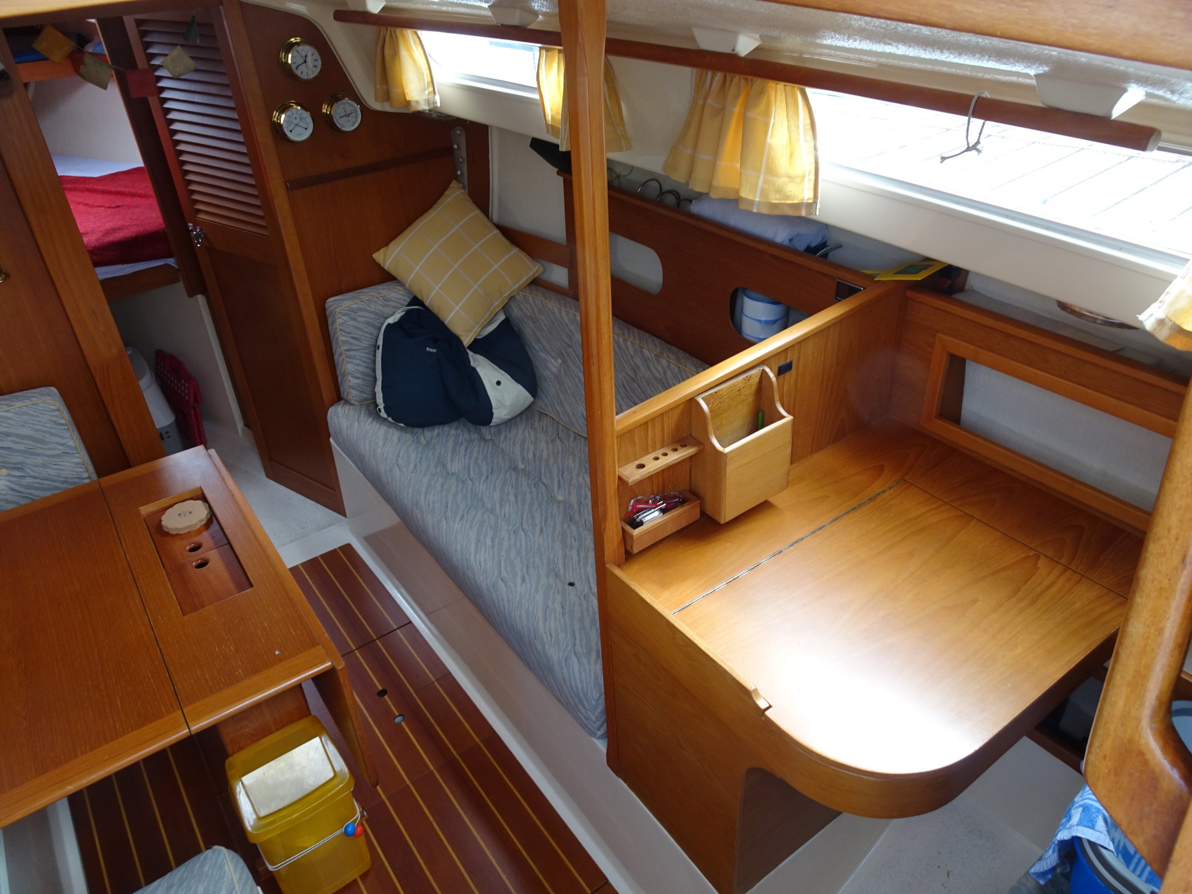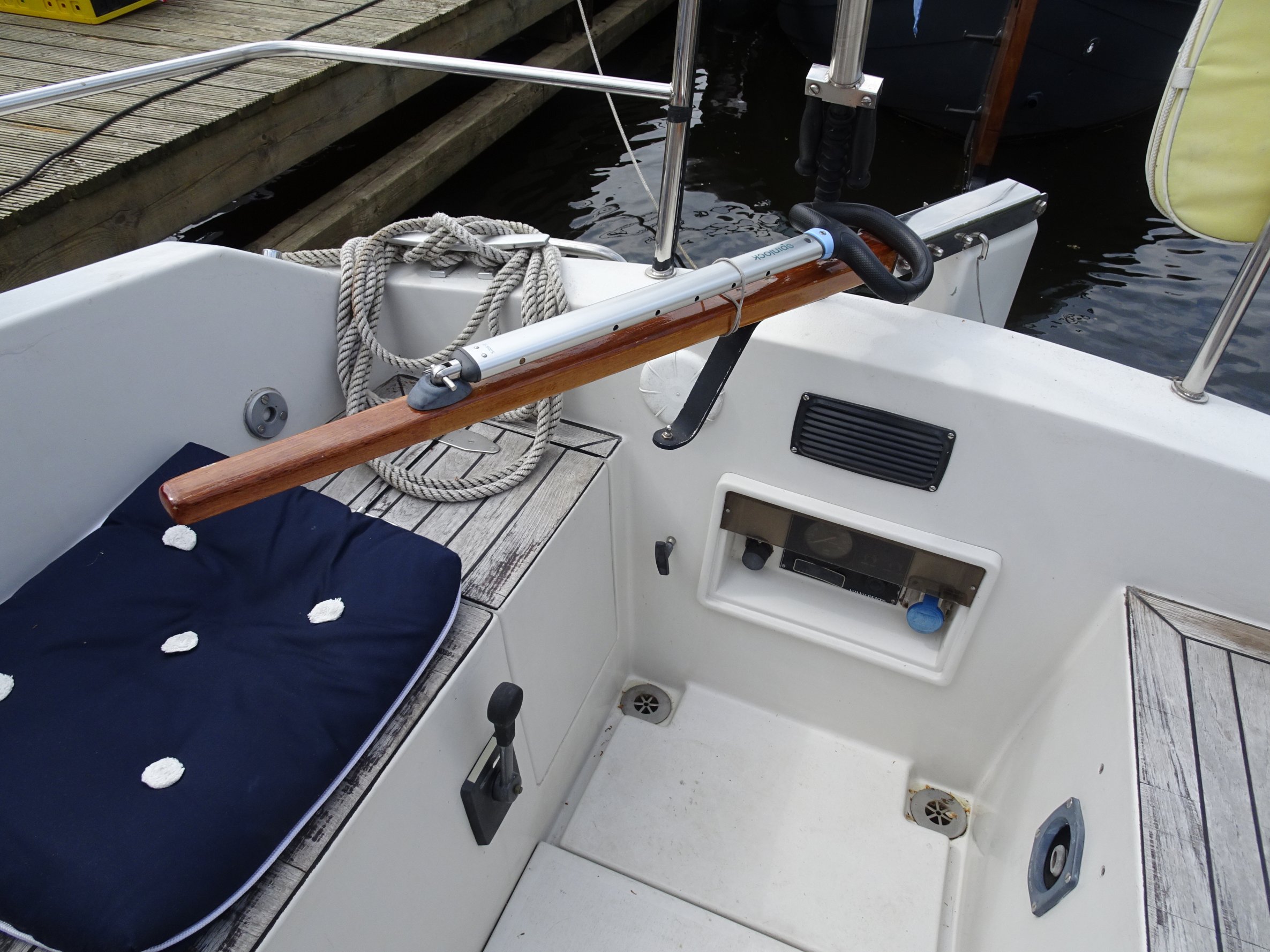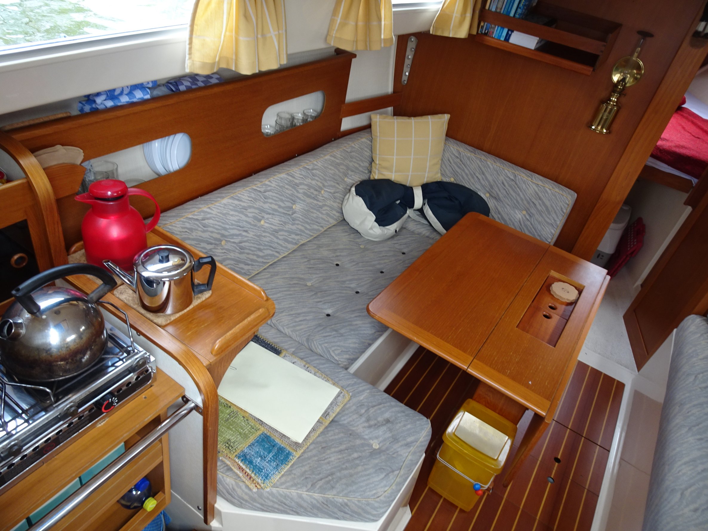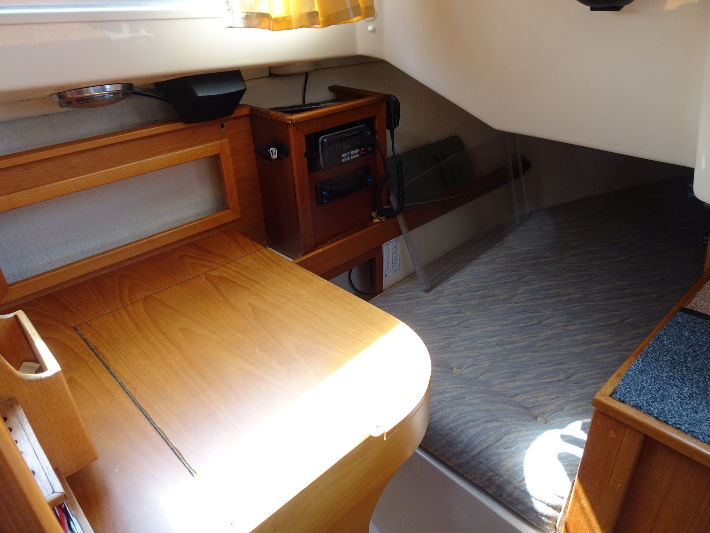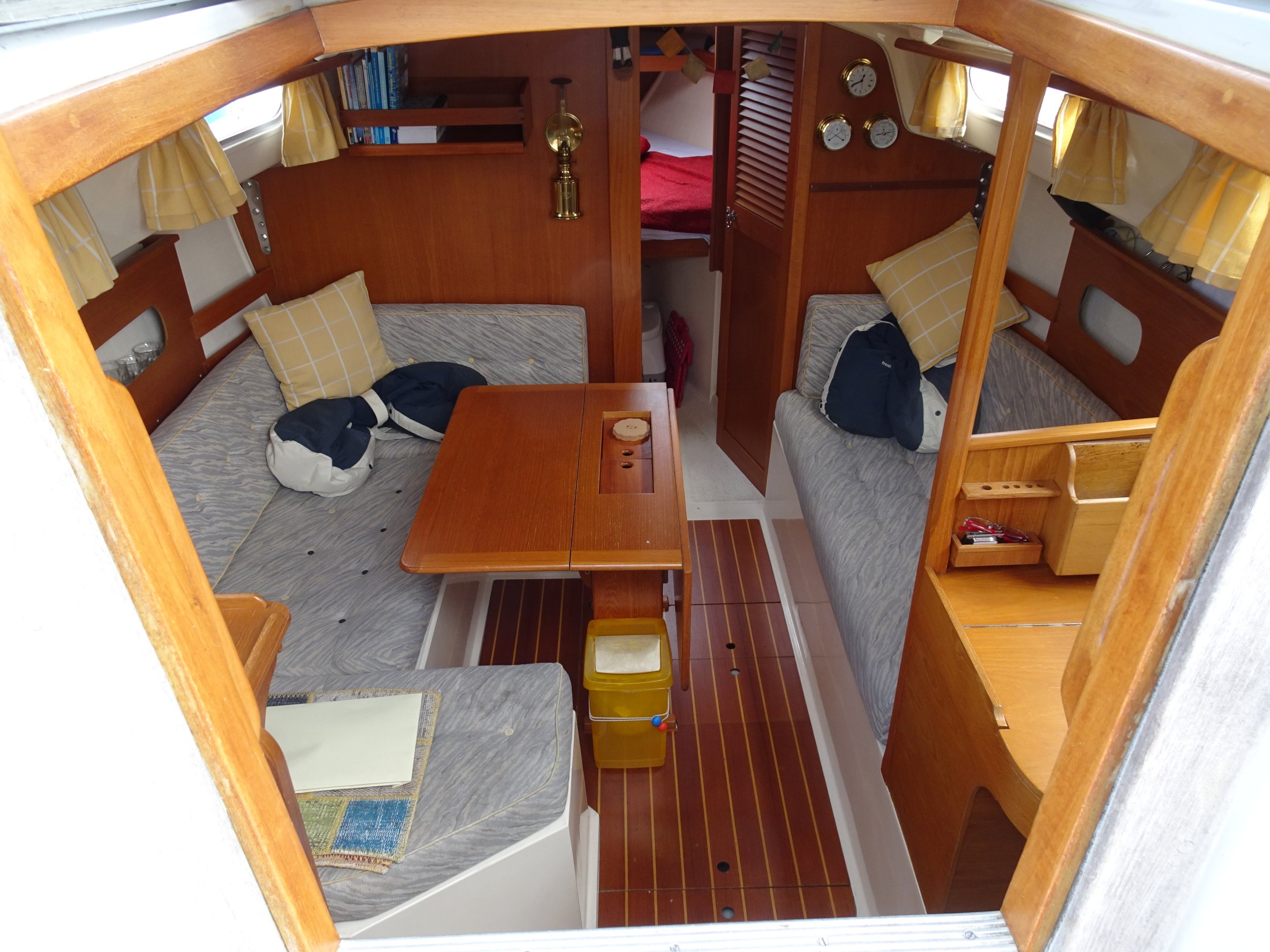 Dan de zeilen, het is tenslotte een zeiljacht. De zeilen zijn van 1995 en allen in nette bruikbare staat. Voor toerzeilen prima, voor wedstrijdzeilen heb je nieuwe nodig. De zeilgarderobe bestaat uit een grootzeil en Genua, voorzeil staat op een Furlex rol/reefsysteem. Alle schoten, vallen, blokken, lijnen in prima staat. Verder staan er 4 Lewmar lieren aan dek en zijn alle lijnen richting kuip verlegd, prima solo te zeilen dus. De Sprayhood, huik voor het grootzeil en voorzeil in zeer goede staat, bekijk de foto’s maar even. Zeer netjes.