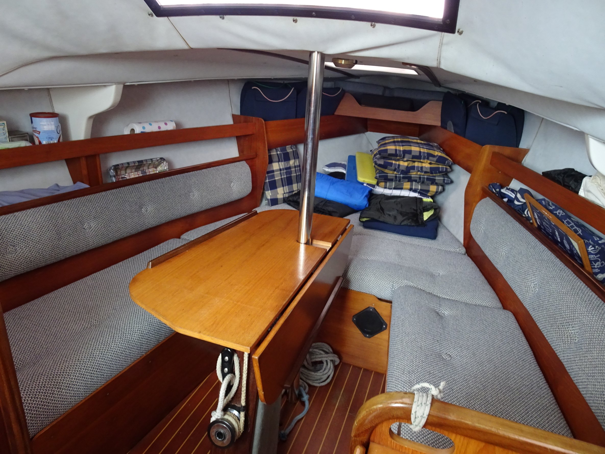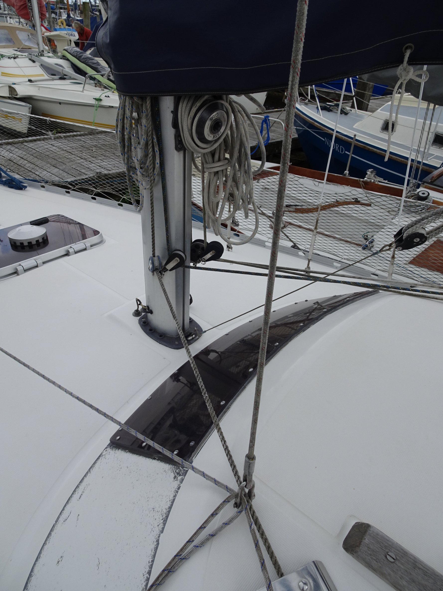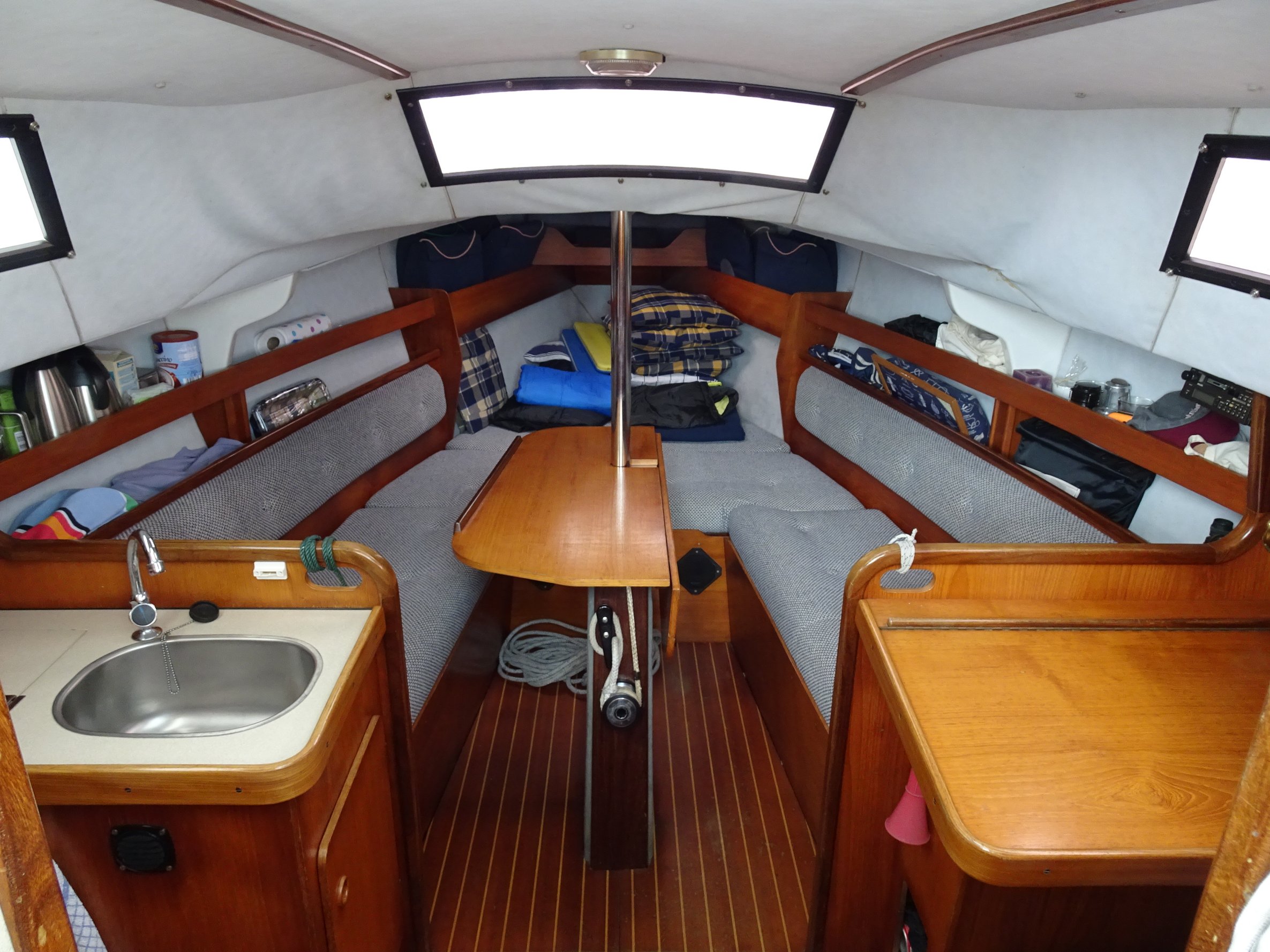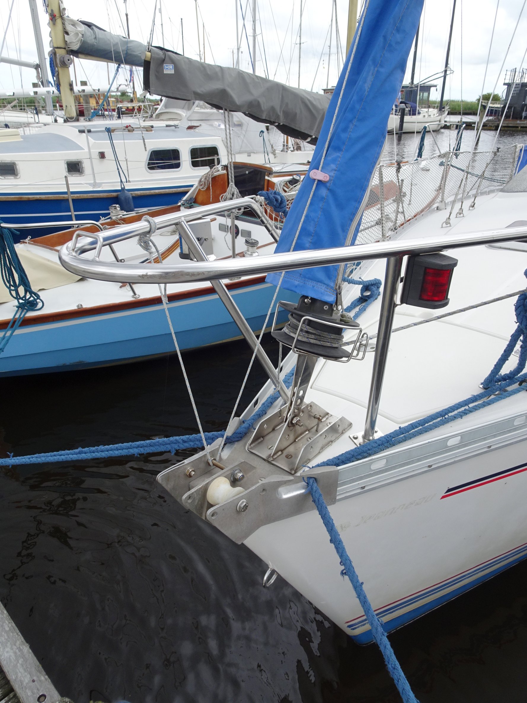 Verder is het schip plezierig compleet, de belangrijkste zaken als een toilet aan boord, koelkast, kompas, dieptemeter, GPS, spoelbak met kraan, kooktoestel etc. etc. zijn allemaal aanwezig. Qua zeilen is het ook keurig geregeld. Er zit een grootzeil bij, een Genua (op rol/reefsysteem van Plastimo), een stormfok en een Spinnaker met boom. Alle lijnen lopen naar de kuip, deze boot is prima solo te zeilen.