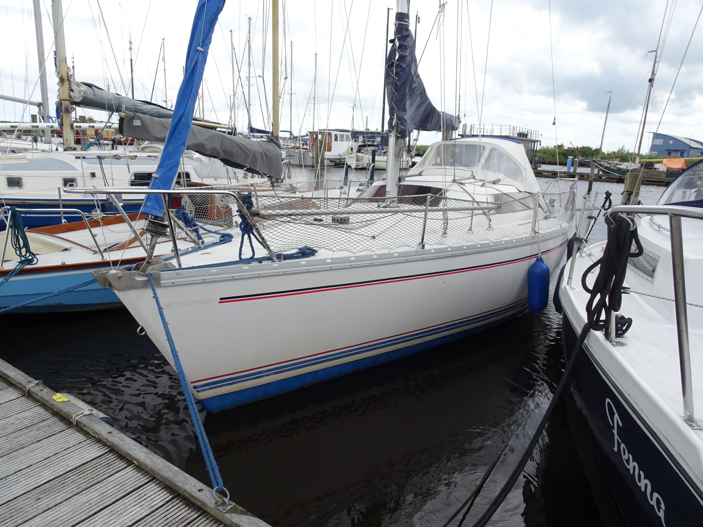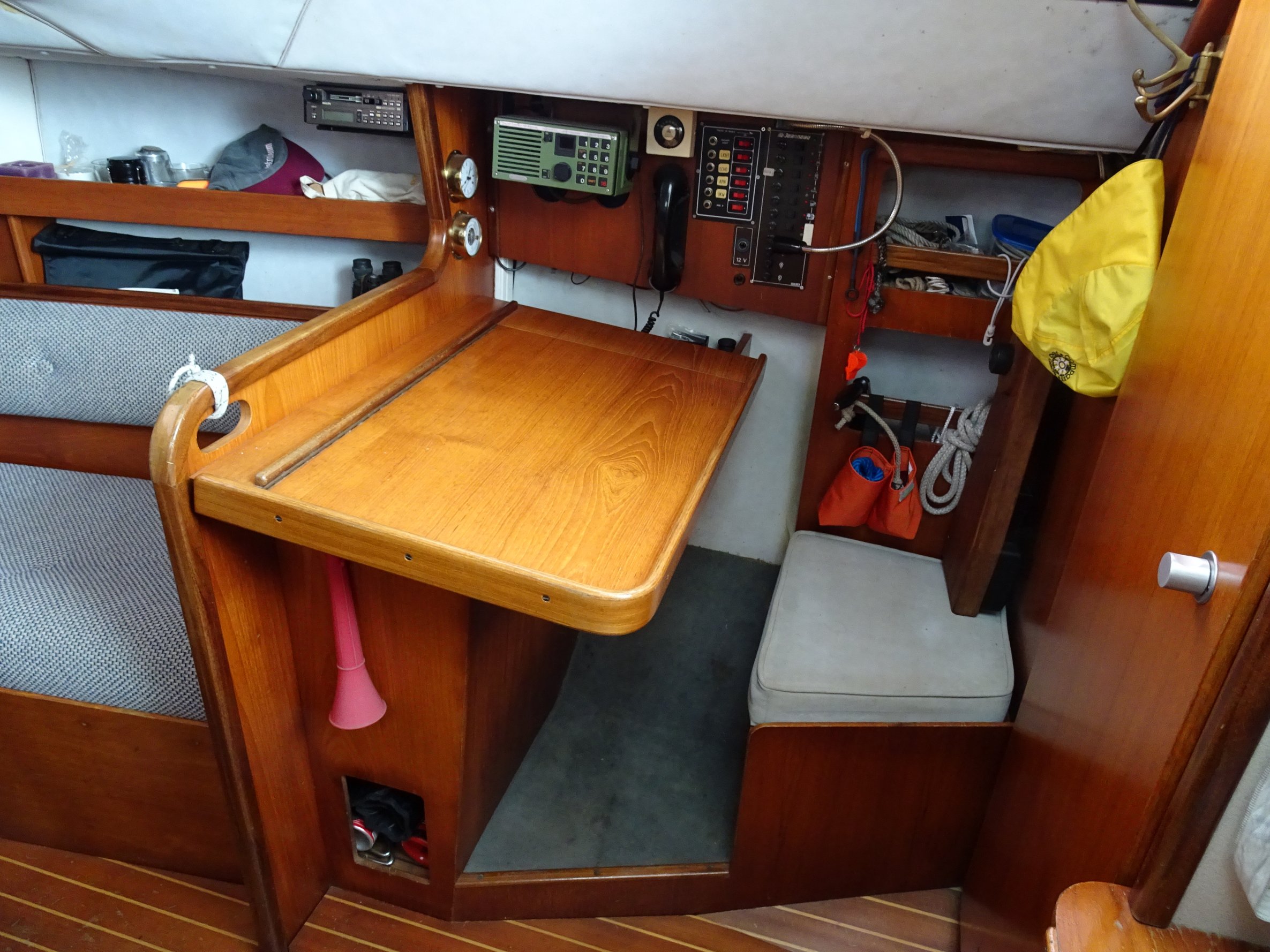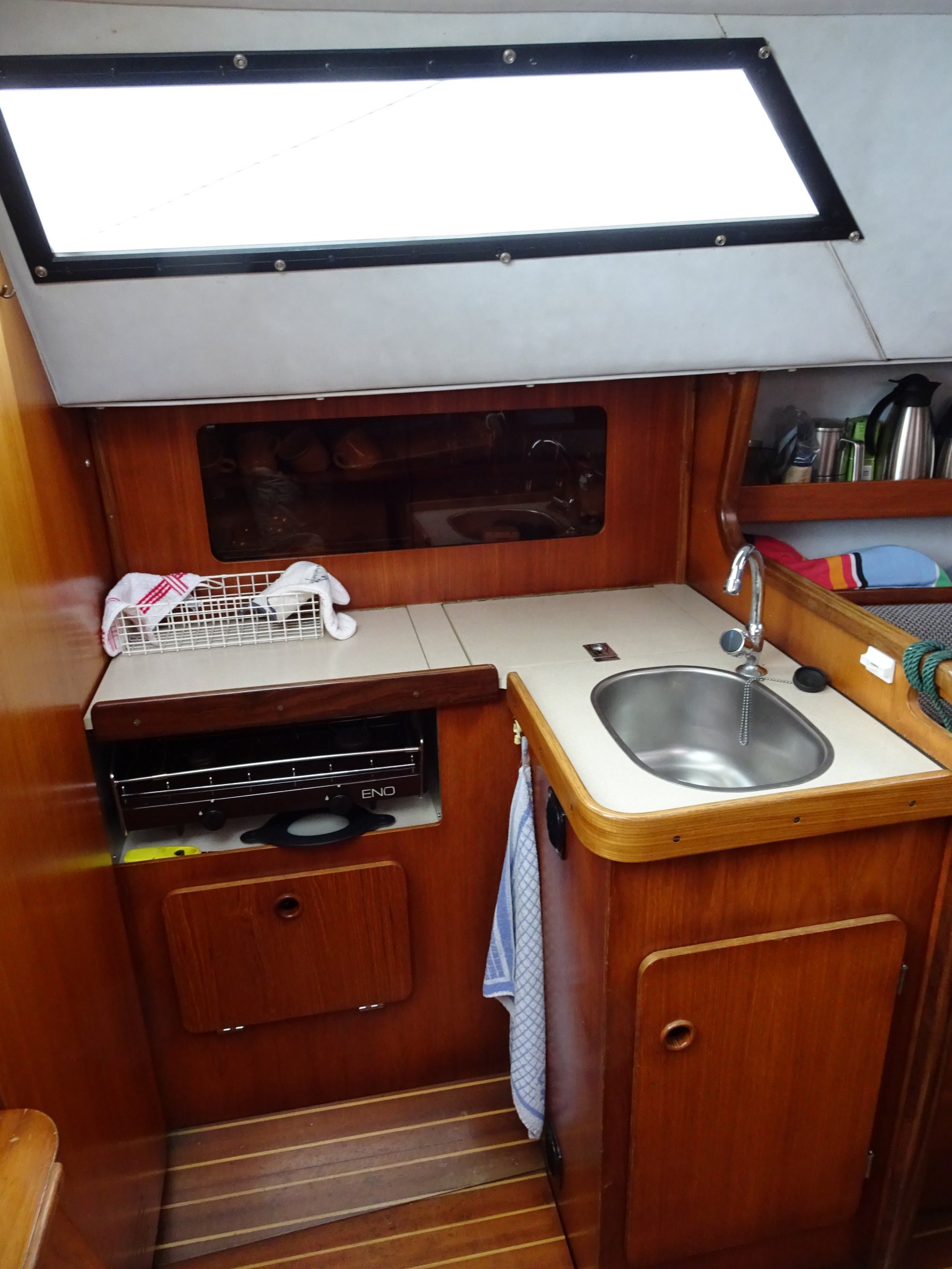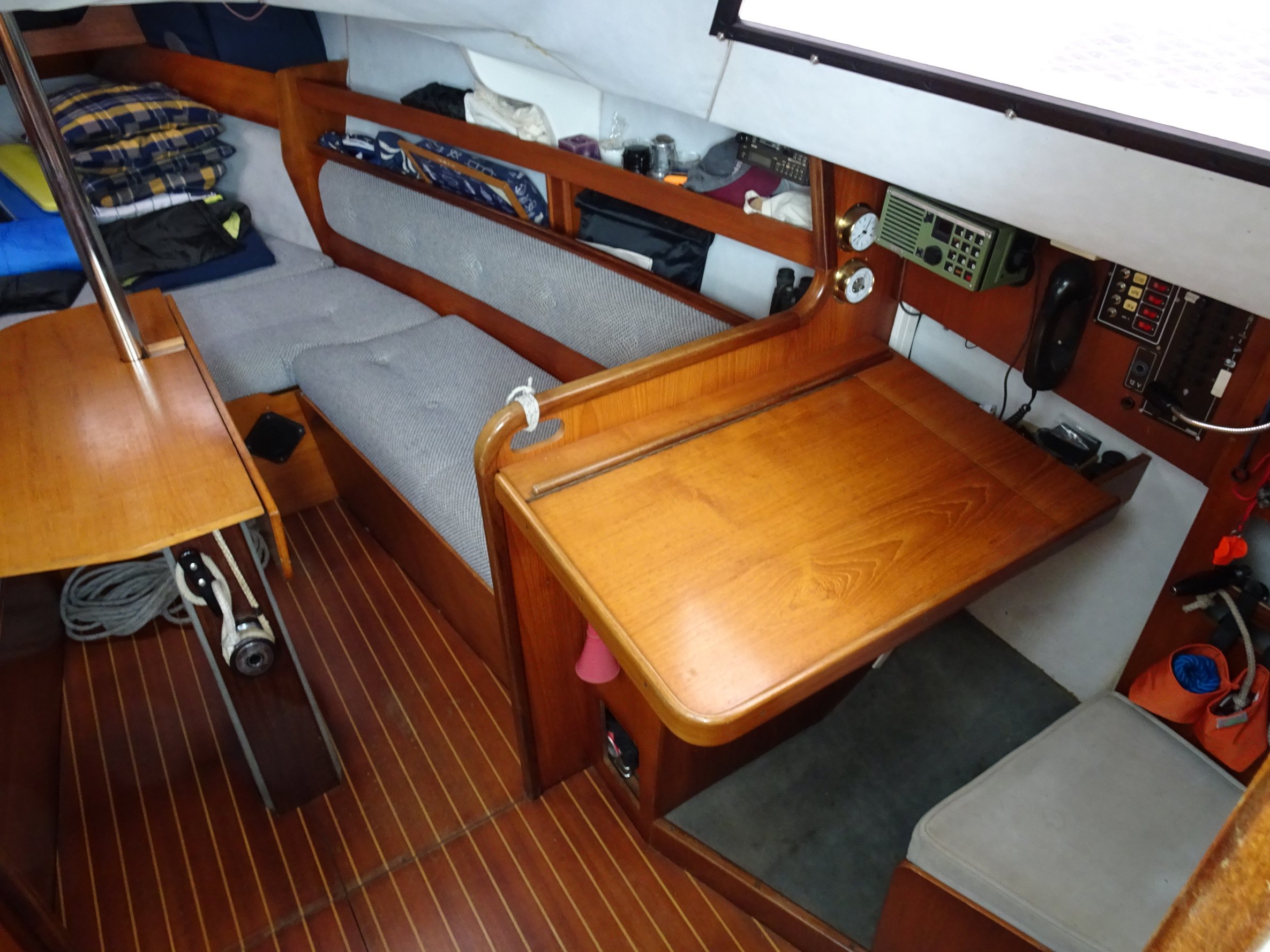 Verder is het schip plezierig compleet, de belangrijkste zaken als een toilet aan boord, koelkast, kompas, dieptemeter, GPS, spoelbak met kraan, kooktoestel etc. etc. zijn allemaal aanwezig. Qua zeilen is het ook keurig geregeld. Er zit een grootzeil bij, een Genua (op rol/reefsysteem van Plastimo), een stormfok en een Spinnaker met boom. Alle lijnen lopen naar de kuip, deze boot is prima solo te zeilen.