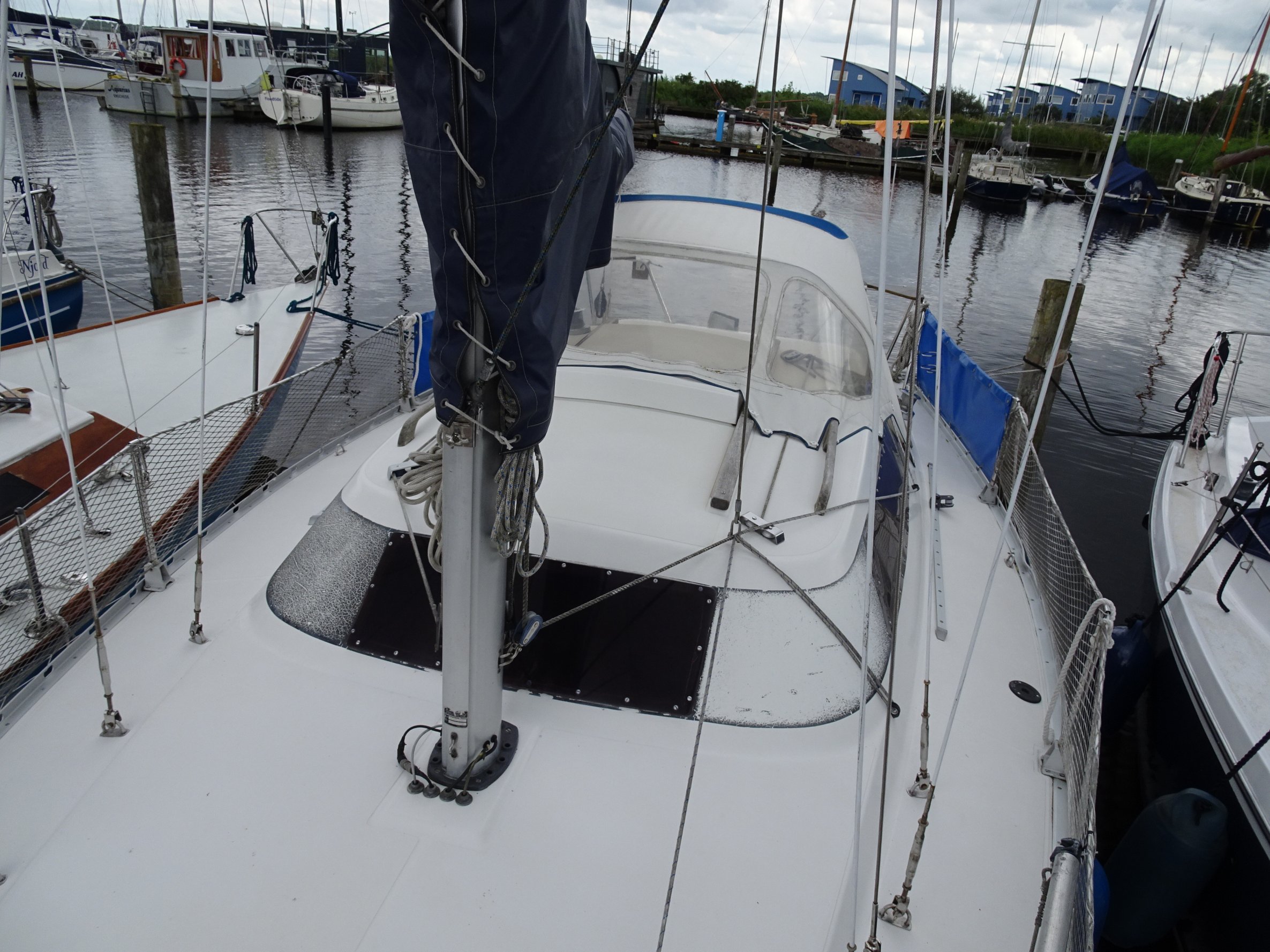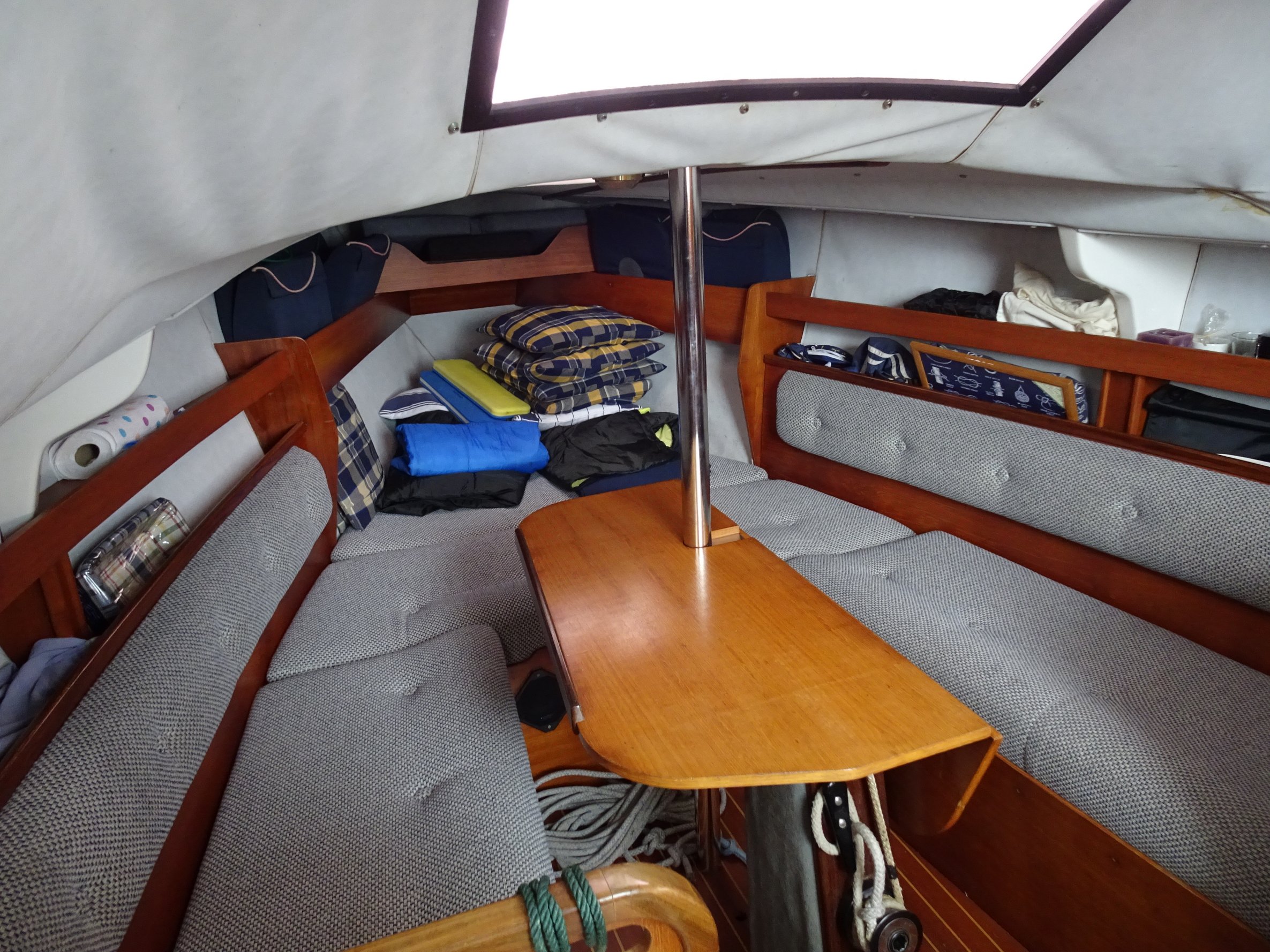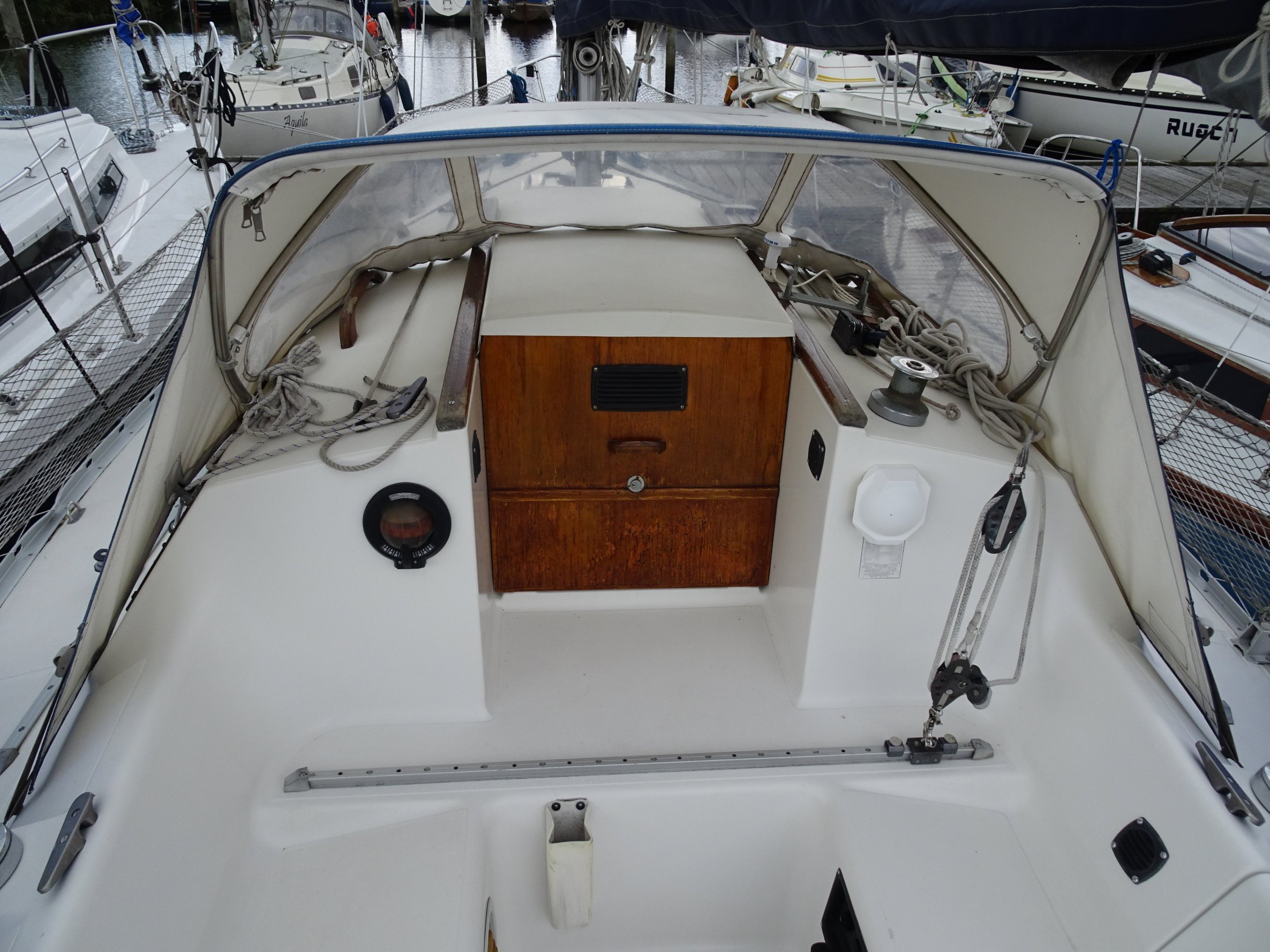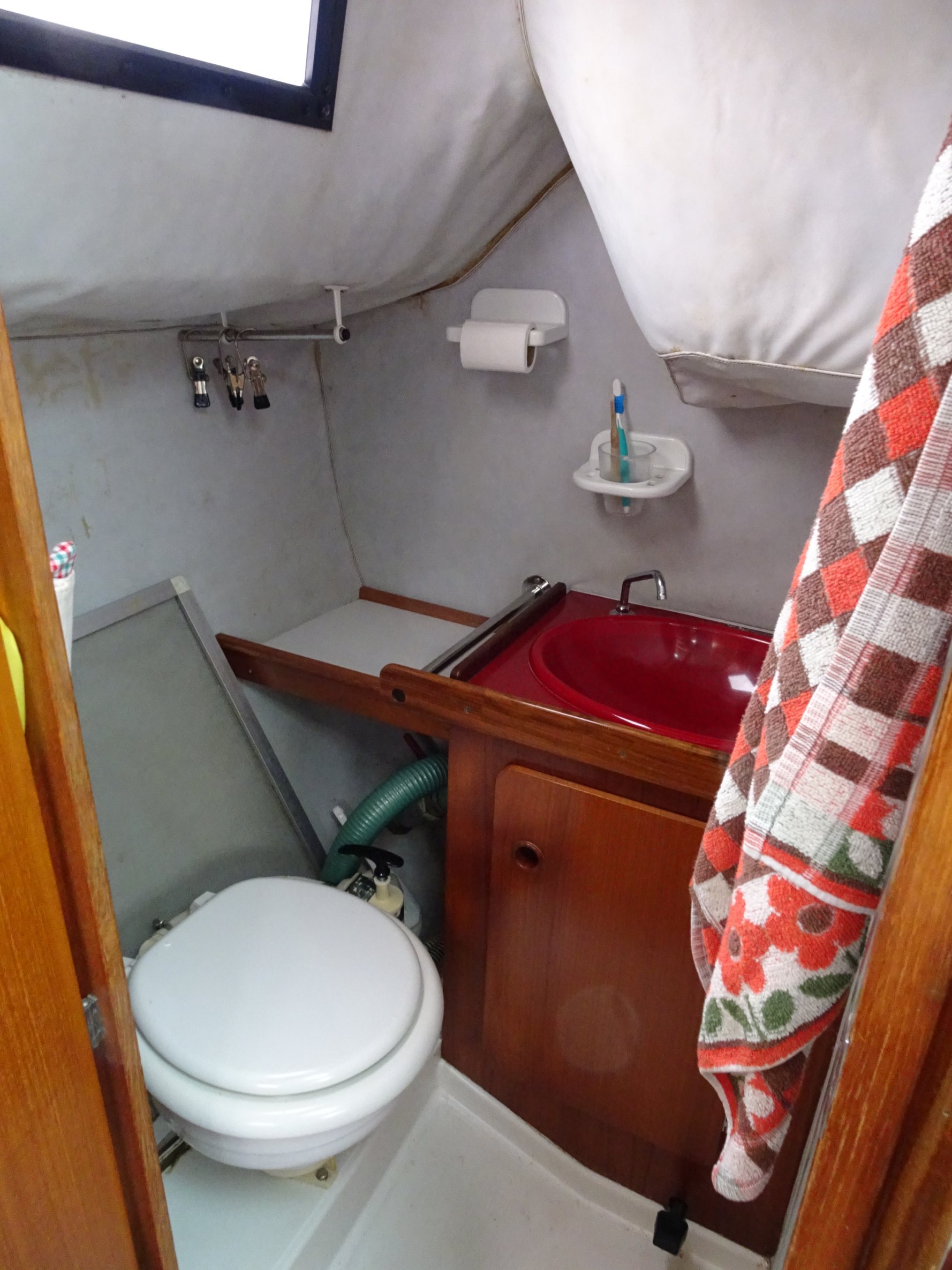 Verder is het schip plezierig compleet, de belangrijkste zaken als een toilet aan boord, koelkast, kompas, dieptemeter, GPS, spoelbak met kraan, kooktoestel etc. etc. zijn allemaal aanwezig. Qua zeilen is het ook keurig geregeld. Er zit een grootzeil bij, een Genua (op rol/reefsysteem van Plastimo), een stormfok en een Spinnaker met boom. Alle lijnen lopen naar de kuip, deze boot is prima solo te zeilen.