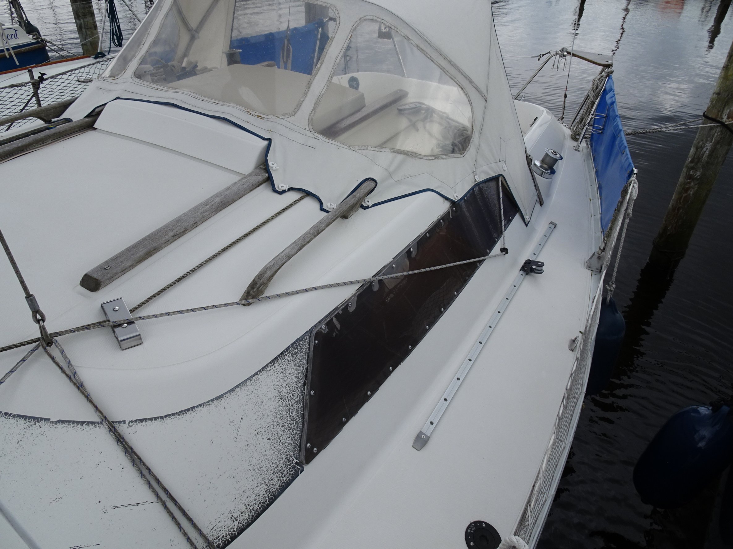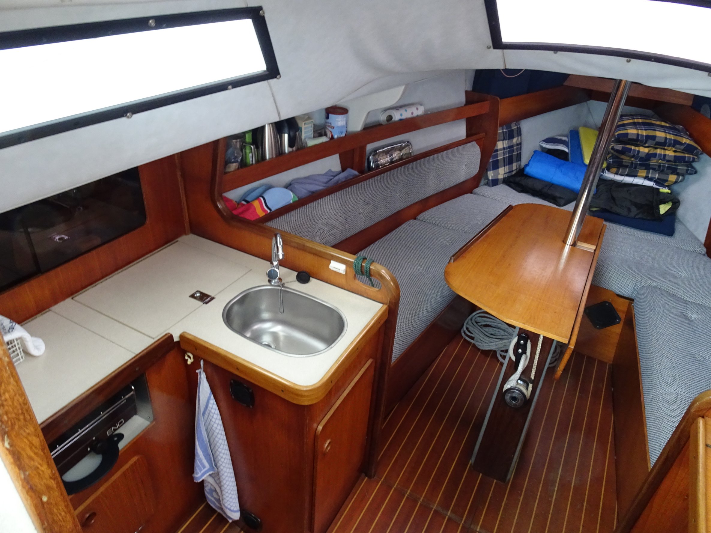 Het gaat hier om een keurige frisse boot die recent voorzien is van nieuwe antifouling en ’s winters altijd op de kant staat in een overdekte loods. De motor krijgt jaarlijks onderhoud en de Duitse eigenaren zijn altijd voorzichtig met deze Jeanneau Fantasia 27 geweest, dat zie je aan alles, er wordt goed op de boot gepast. Een bekend euvel van deze zeiljachten is dat de bekleding van het plafon (plak vinyl) wanneer het op leeftijd komt niet heel netjes meer is. Bij deze Jeanneau valt het mee, plafon en wandbekleding zijn redelijk nog.